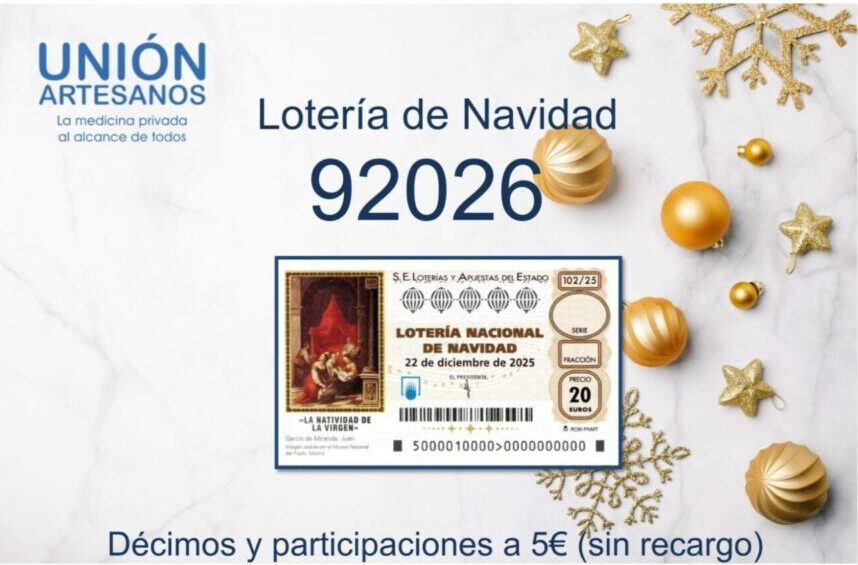 Como ya viene siendo tradición en nuestra entidad, la Unión de Artesanos pone a disposición de sus Mutualistas la posibilidad de adquirir participaciones y décimos de un único número de la lotería de Navidad, cuyo sorteo se celebrará el próximo 22 de diciembre de 2025. Este año «jugamos» con las esperanzas puestas en el  número 92026, en décimos y participaciones de 5,00 € y sin ningún tipo de recargo. ¡No se quede sin ella!.